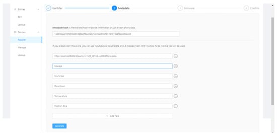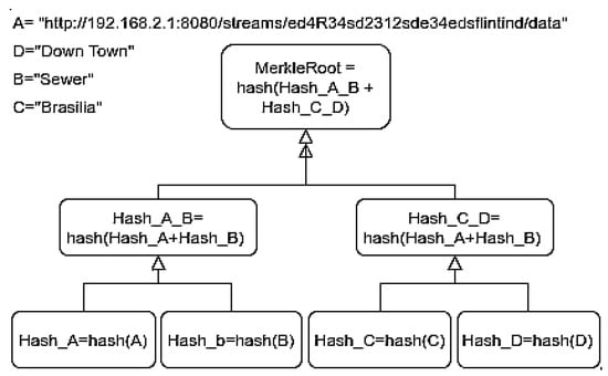 Decentralized security management of IoT sensors with Blockchain ensures greater credibility, more substantial transparency, and resilience to SC Apps’ security, given the guaranty of a trust data source []. Thus, the Blockchain needs to be fed with some characteristics that identify the edge IoT device as metadata. A strategy for verifying this previously registered metadata is to undertake a Merkle tree with then and store it in a Blockchain. The proof of metadata presence in a Merkle Tree is used for future verification of data validation.