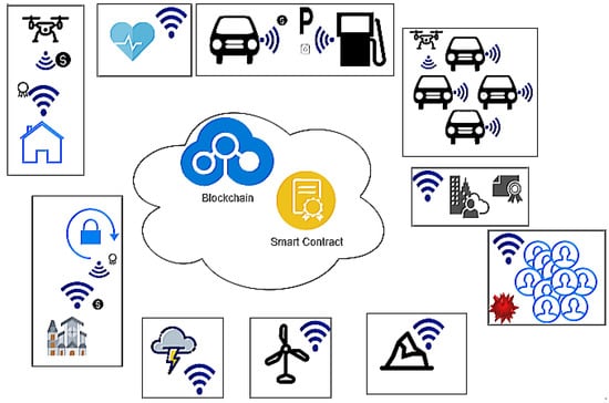 We can find a pros and cons analysis of Blockchain integration’s possibilities with IoT in []. The work combines Blockchains and IoT, and emphasizes the power of this union of technologies. It can be quite powerful, where Blockchain provides resilient and truly distributed peer-to-peer systems, the ability to interact reliably and without auditing. By approaching Smart Contracts, the work shows that it is possible to automate complex processes, with IoT devices being the contact points with the physical world. In the article, the combination of Smart Contract, Blockchain, and IoT is a breakthrough in automating workflows in new and unique ways, which enables cost-effective and time-saving cryptographic verifiability. Its conclusion estimates that the integration of Blockchains into IoT applications causes significant transformations in various sectors of the economy, bringing new business models and rethinking systems and process implementation.