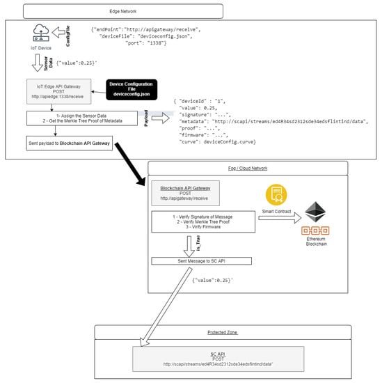 We propose HTTP API Gateways in IoT Device, Edge Computing, Network Gateway, Fog Computing. A local HTTP API running in an IoT device receives the messages from an IoT device. The messages that are received in this local HTTP API are signed and they send payloads to an HTTP endpoint that works as an API gateway. For verification and validation, the payload sent contains the sign message, the IoT firmware, the address of SC web service API, and other metadata of interest that identify the data source’s origin, reliability, and truthfulness of data. On the delivery of payload, the API Gateway checks the message and its signature, metadata, Merkle Tree proof, and firmware on the Blockchain by Smart Contract; if the payload is validated, it is sent to the SC web service API that is extracted from the payload metadata.