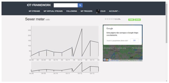 We chose this project to represent an SC API due to its components being developed to scale. The core of its API is developed in Erlang, a platform that has shown promise in products that need to meet a large number of requirements. Figure 10 shows its web interface, with a graph resulting from data that were collected from our testbed’s IoT devices. In detail, a graph of density information in public sewage.