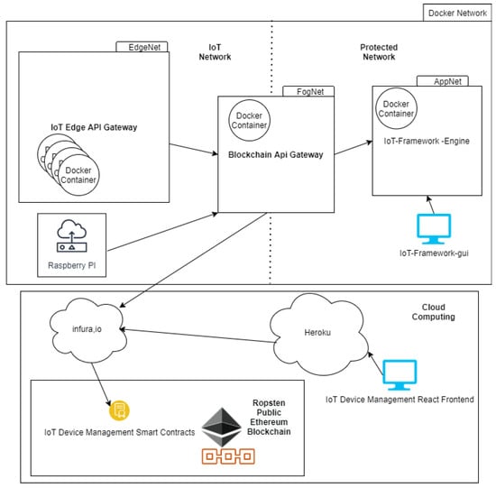 The only container that has contact with IoT devices and SC API is the container running on Blockchain API Gateway in FogNet. The containers were deployed in the EdgeNet, with resources being limited in 200 Mhz of CPU and 200 MB of RAM, running IoT Edge API Gateway, representing the IoT devices. In the AppNet, we deploy SC API. As a SC API, we use the IoT-Framework Engine [] application from work [] and its IoT-Framework-Gui [] frontend.