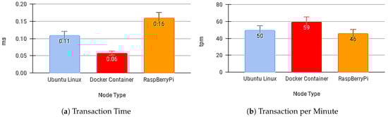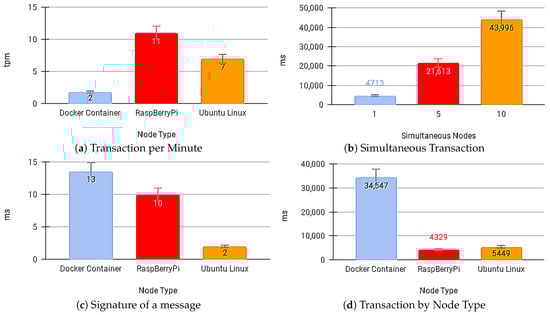 Figure 13b shows the average time for a transaction on the IoT API Edge when considering the shipping competition with other devices on the network. Figure 13d shows the average transaction time on the IoT API Edge by device type. Figure 13c shows the average time to IoT API Edge sign messages by technology. Figure 13a shows the number of transactions per minute achieved on devices using IoT API Edge to send payloads to the IoT Blockchain API Gateway and receive a response from the SC App API.