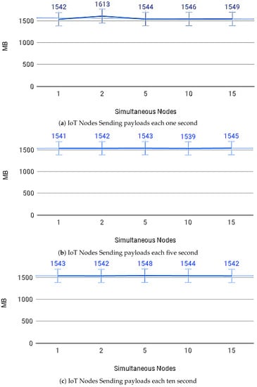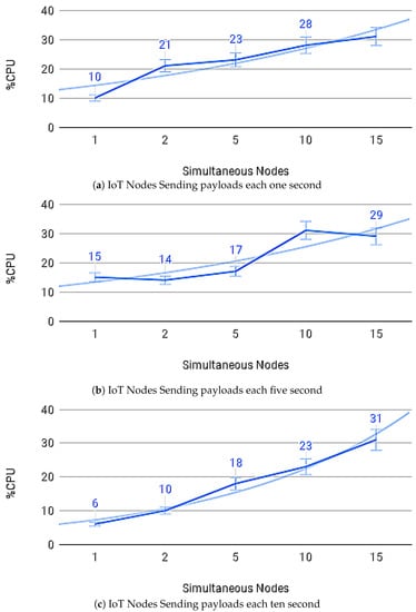 Figure 14a–c show the average payload transfer and validation times on the IoT Blockchain API Gateway when considering the competition for sending with other devices on the network with one, five, and ten devices running the IoT Edge API Gateway. Figure 15a–c show the average of CPU use and Figure 16a–c memory use, during transactions in the IoT Blockchain API Gateway.