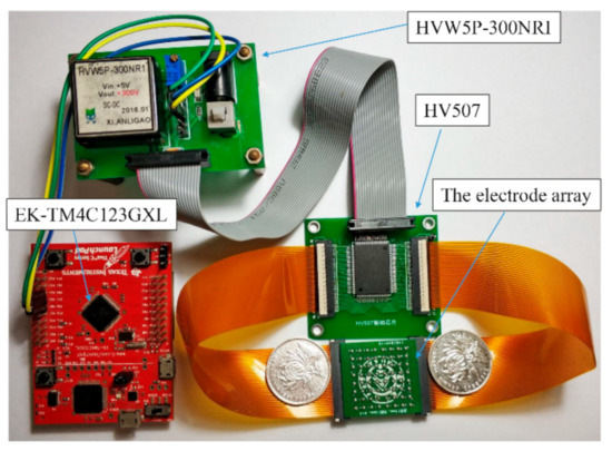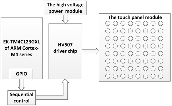 The proposed system consists of four main modules: (1) The touch panel module is a square array composed of 8 × 8 spherical electrodes, where the diameter of each electrode is 1.5 mm and the center distance between adjacent electrodes is 3 mm. Each spherical electrode was fabricated with solder tin melted on printed circuit board (PCB) pads designed by the authors. The area of the 8 × 8 spherical electrode array is 27 × 27 mm and is similar to a coin in size, as shown in Figure 2 and Figure 3. The touch panel module is the human-computer interaction interface, and this module is connected to the stimulating signal driver module using a flexible flat cable (FFC). (2) The central control module is constructed with an EK-TM4C123GXL board (ARM Cortex-M4 microcontroller), which is responsible for controlling the driving module of the electrode array. (3) The stimulating signal driver module is implemented with an HV507 chip, which is a low-voltage serial to high-voltage parallel converter. It is utilized to output a high voltage on selected electrodes of the electrode array with designed output sequences. (4) The high-voltage power module (HVW5P-300NRI from Xi’an Ligao Elec. Tech. China) provides the high voltage (adjustable from 0 to 300 V) for the stimulating signal driver module.