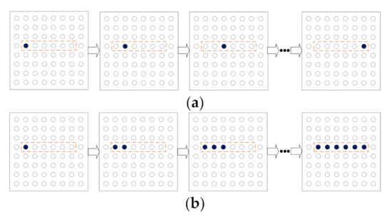 Two different sequential stimulating modes for the electro-tactile electrode array have been studied in this paper, i.e., the sequential stimulating signal with single-electrode-in-active (SSS) mode and the sequential stimulating signal with consecutive-electrode-in-active (SSC) mode. The electrodes corresponding to the pixels for rendering the symbol “一”, which is identical to the Chinese character “one”, were stimulated successively according to the stroke order. In the SSS stimulating mode, when the stimulating signal is outputted for the next electrode, the signal for the previous electrode will be turned off. Therefore, the stimulating signal was outputted to one single electrode in the whole procedure of symbol rendering, as presented in Figure 4a. However, in the SSC mode, when the stimulating signal is outputted to the next electrode, signals for the previous electrodes will remain available, which is shown in Figure 4b.