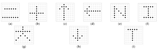 Simple characters’ lattice models: (a) “二”; (b) “十”; (c) “↑”; (d) “←”; (e) “N”; (f) “I”; (g) “大”; (h) “↓”; (i) “T”.