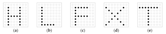 The lattice model of selected five English characters: (a) “H”; (b) “L”; (c) “F”; (d) “X”; (e) “T”.
