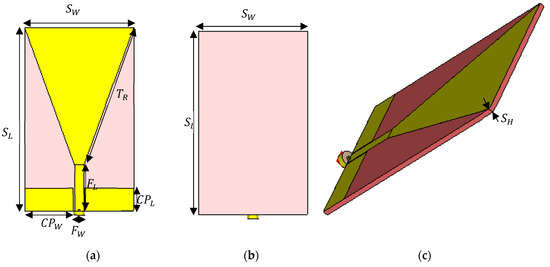 The initial design is a printed triangular monopole antenna (PTMA) [23]. It has a triangular patch with a coplanar waveguide (CPW) and ground on the top plane of the substrate. The dimensions of the antenna were determined by equating the lower frequency, of the PTMA and its dimensions as can be seen in Equation (1) [22]: