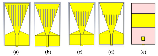 The buoyed antenna and the LoRaWAN Gateway operate at 868 MHz in Europe. Thus, the designed antenna must be able to resonate or operate at this frequency. In order to achieve that frequency of operation on the base PTMA design, some modifications were made to it. A scalene triangle was added to the CPW and 11 braid slots of 1 mm were introduced on the triangular patch antenna. Two rectangular elements were introduced on the bottom plane of the substrate as can be seen from Figure 2e. A rectangular element was introduced from the top end of the braided patch and its length was varied from 5 mm to 35 mm at a step of 10 mm. A representation of these could be seen from Figure 2a–d.