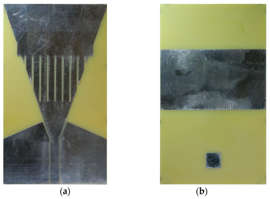 The braid antenna with 35 mm connector was chosen due to its performance. The simulation results for this are shown in Section 3. The optimal substrate thickness was determined as 2.4 mm. This was obtained by performing parametric sweep of the substrate thickness in CST and the 2.4 mm thickness exhibited the best −10 dB bandwidth performance. The fabricated antenna can be seen in Figure 3. It was produced using FR-4 substrate and a copper with a thickness of 35 mico metres by Eurocircuits.