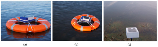 Buoyed sensor node deployed in the North Sea (a) with buffer, (b) without buffer. (c) Data relay node for RSSI tests.