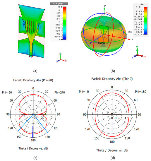 Some of the 35 mm connector braid antenna characteristics can be seen in Figure 13. The surface current can be seen from Figure 13a to be distributed along the slots introduced in the antenna in the form of braids and along the feedline. The antenna has an omnidirectional far-field radiation pattern, as can be seen in Figure 13b, which would enable the antenna to communicate with other sensor nodes in all directions. The antenna has a gain of 2.11 dBi. The antenna also exhibits omnidirectional radiation properties as could be seen from Figure 13d and a bidirectional radiation pattern in the E plane (Figure 13c).