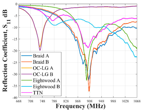 The 35 mm connector braided antenna was fabricated and its reflection coefficient, S11, was measured using an HP8753 VNA. The results can be seen in Figure 14. The TTN, Eightwood, and OC-LG antennas were all measured using the VNA. The −10 dB bandwidth for the OC-LG antennas were resonant at 740 MHz which spans from 723 MHz to 754 MHz resulting in a bandwidth of 31 MHz. Eightwood A Antenna has a bandwidth span of 81 MHz starting from 871 MHz to 952 MHz. Eightwood B starts from 925 MHz. The Things Network (TTN) antenna has a bandwidth that begins at 871 MHz and ends at 964 MHz, spanning a bandwidth of 93 MHz.