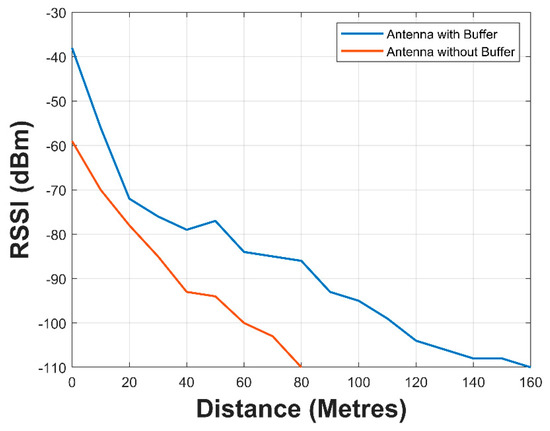 The result for the comparison of the SN antenna with and without the barrier could be seen in Figure 18. The RSSI of the water surface communication for the SN without the buffer could be seen to be worse than the one with the buffer. At 80 m, no signal was received from the SN without the buffer.