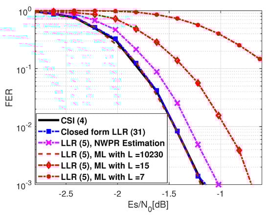 We note that with values –, the observable sample distribution starts to converge to a Gaussian form. Then, the closed-form LLR expression based on the Gaussian approach (31) provides better FER performance than that obtained using a closed form LLR expression based on the Laplacian approach (41). The latter is illustrated in Figure 6 for . In this figure, we also illustrate the case for . Note that under this particular scenario, the observable sample distribution is Gaussian, and the closed-form LLR expression based on the Gaussian approach converges to the CSI-based LLR value solution. Furthermore, independently of the scenario, the proposed closed-form LLR expression performs better than the LLR solution from (10) considering that is instantaneously computed from the NWPR method. The required to obtain an FER of is included in Table 6.