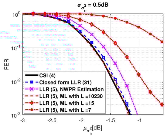 A second experiment was done where smooth variations of the variance were considered. The variation can be characterized by a normal distribution whose mean and standard deviation are denoted as and , respectively. Again, the NWPR method was used to estimate symbol-wise. Notice from Figure 2 that the proposed LLR approximation converges to the perfect CSI-based LLR solution, whereas the ML method converges only when large L are considered, resulting in an increased complexity. Again, in order to facilitate the comparison between the different LLR expressions, we provide in Table 3 the required to obtain a frame error rate (FER) of .