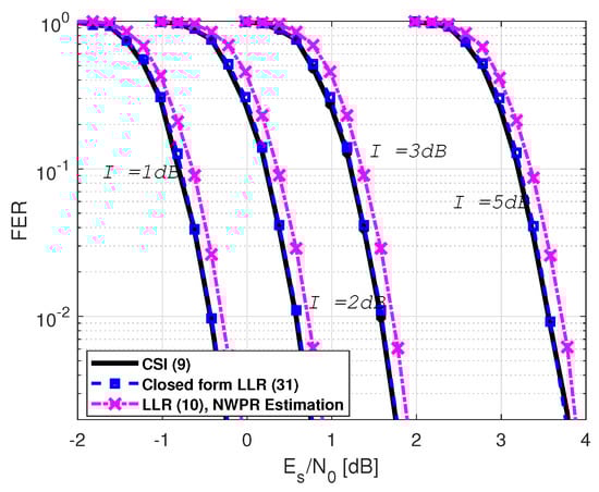 In a third experiment, we assessed the performance considering a Gaussian jamming environment. The scenario sets a constant signal-to-noise plus interference ratio over the entire transmission codeword. We used the NWPR method to infer symbol-wise. Figure 3 shows the FER considering different interference powers ( dB, dB, dB, and dB) corresponding to: the perfect CSI-based LLR values given by (9); the closed-form LLR approximation in (31), considering that and are estimates from the symbol-wise estimates values; the LLR solution from (10) considering that is instantaneously computed from the estimates provided by NWPR method. We can see that the proposed closed-form LLR expression performance converges to the CSI LLR solution independently of the interference power. This solution improves the FER provided by just considering the NWPR method. On the other hand, even if the ML curves are not included in this figure (for the sake of the clarity of the plots), the same results as the previous experiments were found. The required to obtain an FER of is included in Table 4.
