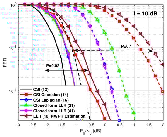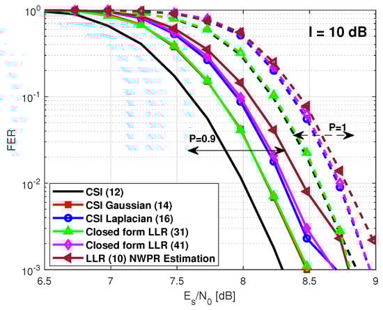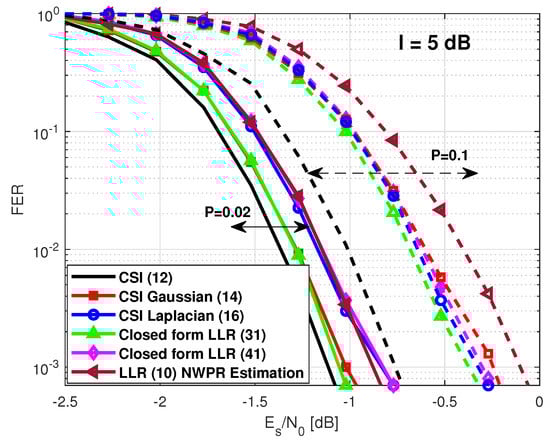 Finally, we assess the performance considering a pulsed jamming environment. Several scenarios were considered. First, we focus on scenarios with low values of P. Note that with intermediate values of P, it is simpler to detect the jammer, and other counter-measurements in the previous stage of the receiver chain can be applied. We consider a scenario where a jammer device disrupts with an extra Gaussian noise of 5 dB to each symbol . Again, a symbol-wise estimator based on the (NWPR) method was used to estimate the . Moreover, we included the solutions of the LLR expressions (14) and (16) considering perfect knowledge of and . In Figure 4, the FER for the cases with and is illustrated. Since the power of the jamming is not powerful enough to generate large heavy tails in the observation sample distribution, the closed-form LLR expression based on the Laplacian distribution (41) performs worse than the closed-form LLR expression provided in (31). Moreover, we note that the closed-form expression (31) converges to the LLR solution (14) with perfect CSI and that the closed-form expression (41) converges to the LLR solution (16) with perfect CSI. The required to obtain an FER of is included in Table 5.