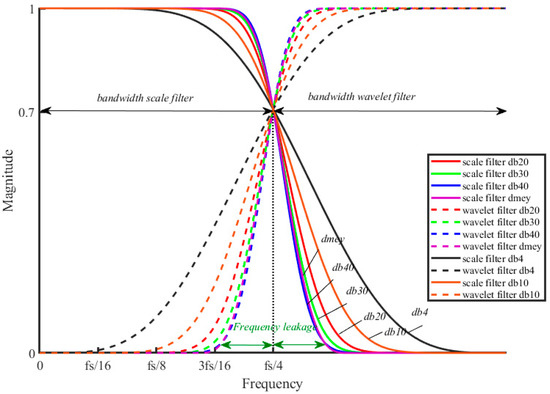The QMF filters frequency response of the first level DWT decomposition is shown in Figure 1. It depicts a comparison of the scale and wavelet filters between the db4, db10, db20, db40, and dmey mother wavelets used on the MRA method. The filters have overlapping frequency bands and energy leakage occurs between the two adjacent bands affecting the obtained coefficients. It is less pronounced with db40 and dmey mother wavelet.