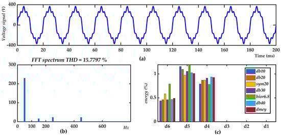 Voltage signal with harmonics: (a) Instantaneous representation, (b) FFT spectrum, (c) distribution of the energy percentage of the signal according to the coefficients of the mother wavelets.