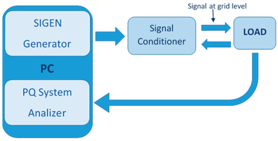 Developed system scheme: Voltage generator with preset disturbances, power amplifier, and signal conditioner, load and Power Quality Analyzer.