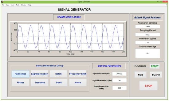 Matlab® software has been used to program a virtual signal generator, called Sigen, which allows a complete configuration of the signals required for testing. Sigen mainly generates a pattern based on the parameters defined by the user; thus, steady-state and/or transient-state disturbances can be modelled. The Graphical user interface of single-phase Sigen is shown in Figure 4.