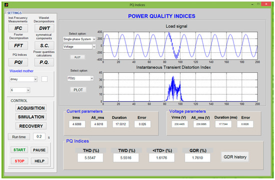 According to Equations (5), (6), (8), (9), (11) and (12) the PQIs are computed. The PQ indices have been tested on a variety of stationary, non-stationary single-phase signals as well as balanced or unbalanced three-phase signals.