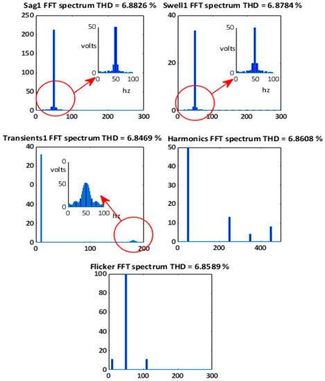 Several disturbed voltage waveforms extracted from the developed platform are analyzed. In particular, the considered signals are three voltage sags and two swells with different duration and amplitude, three oscillatory transients with distinct frequency and duration, a steady-state distorted voltage with three harmonics (5th, 7th, and 9th with relative amplitudes depicted in the FFT spectrum of Figure 6) and a flicker disturbance. Some of them are depicted in Figure 7 and they all only have in common a similar THD value.
