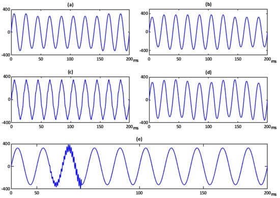 Single-phase voltage disturbances with similar THD. (a) Voltage sag1. (b) Voltage swell1. (c) Harmonic disturbances. (d) Flicker disturbance. (e) Transient1 disturbance.