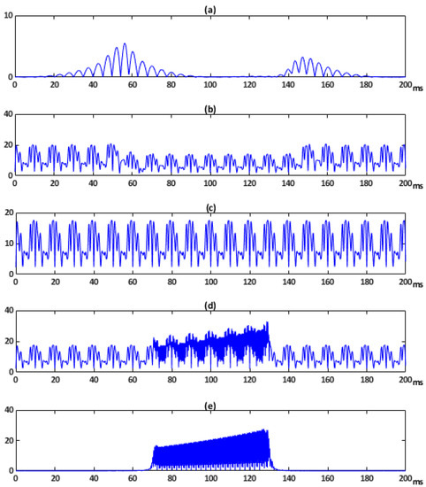 Figure 9a depicts the ITD(t) corresponding to a pronounced sag. It shows two peak value: 5.5% at 56.25 ms and 3.3% at 147.25 ms. Figure 9b shows this index for a combination of the mentioned sag and a steady-state distorted voltage with five harmonics (3rd, 5th, 7th, 9th, and 11th and Vrms equal to 10 V, 17 V, 7 V 13 V, and 3 V, respectively). The ITD(t) resulting from a steady-state distorted voltage only with the five harmonics is provided in Figure 9c. In addition, Figure 9d shows this index for a combination of the same steady-state voltage and an important transient oscillation. The ITD(t) of a voltage disturbed only with this single transient is shown in Figure 9e. It has a peak value of 30% at 127 ms.