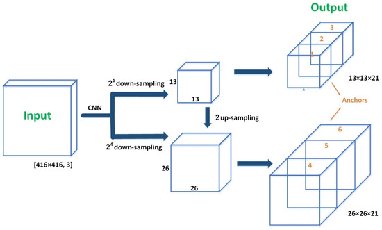 CG-YOLO is based on the deep learning framework Darknet [29,30,31], which is used to extract features. The backbone network contains a total of 75 layers, of which 53 are convolutional layers and the rest are res layers. The characteristic interaction layer of YOLO network is 75–105 layers. In order to detect objects of size, the input image was down-sampled five times to get different scale. The result of the fifth down-sampling was outputted, and then, this result was up-sampled to integrate the result of the fourth down-sampling as the output of another scale. When the input image was 416 × 416, the outputs were 13 × 13 and 26 × 26 through CNN. The network structure of CG-YOLO is shown in Figure 1.