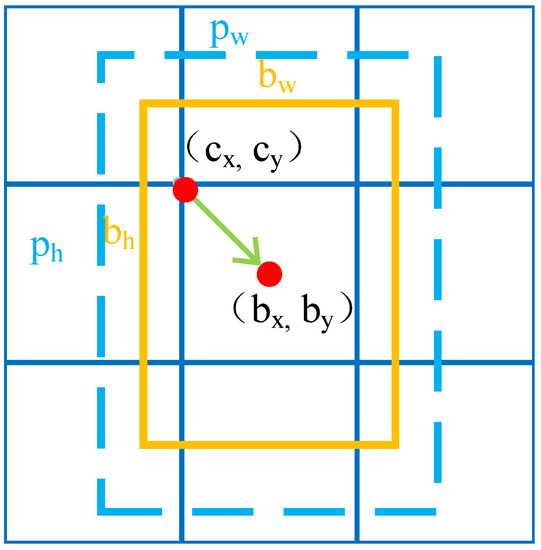 However, the anchor box does not match the object in the image, so it needs to be adjusted to become a prediction box, the process is shown in Figure 2. First, the initial position of the anchor box (cx, cy) is the position of the cell in 13 × 13 or 26 × 26, which is adjusted by offset according to the returned (tx, ty). Then, the width and height of the anchor (pw, ph) are adjusted according to the returned (tw, th). Finally, a prediction box (bx, by, bw, and bh) is formed, and the formula is as follows: