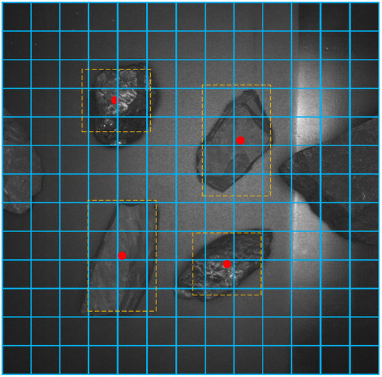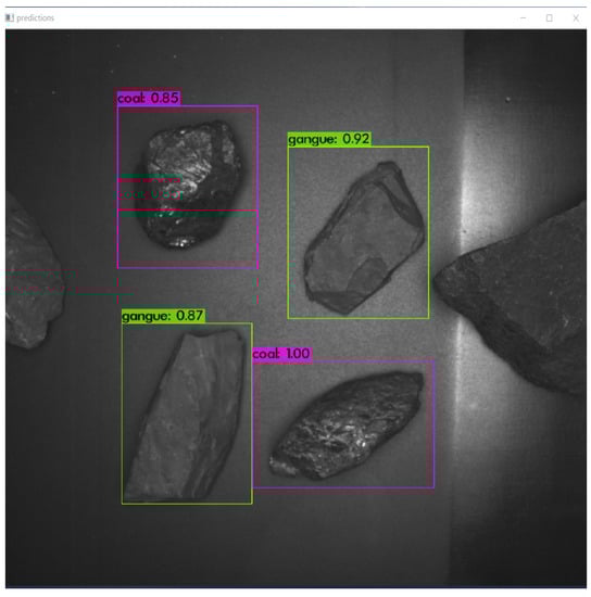 In real-time coal and gangue sorting robot experiment based on target detection, we take the captured picture 2048 × 2048 scaling to the input size of the convolutional network 416 × 416 according to the aspect ratio as input. The frame coordinates obtained through the above network are (tx, ty, bh, and bw), i.e., the bounding box is relative to the location and size of the feature map and the confidence level. After Non-Maximum Suppression (NMS), predictions with high confidence are left. At the same time, the maximum number of prediction boxes is set to 20. The return information of the prediction box is enlarged to the original picture 2048 × 2048, and the target in the picture is finally detected as shown in Figure 7, and each is returned separately. The confidence levels of the target, the position, and the width and height of the prediction box are as shown in Table 2.