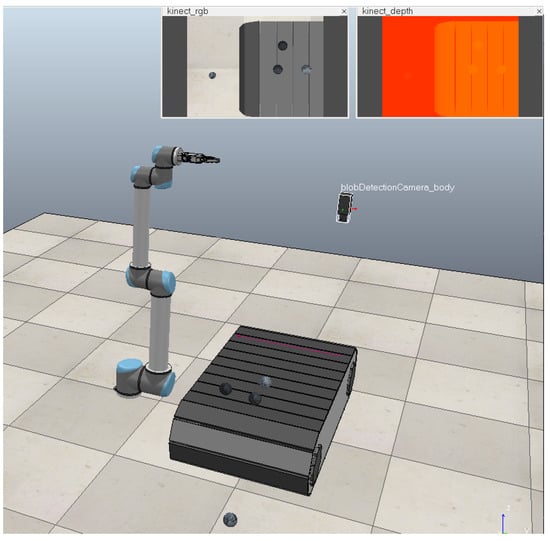 The system is composed of target, image collector, conveyor belt, image recognition system, mechanical arm, and robot control system, as shown in Figure 5. In CoppeliaSim, randomly shaped coal and gangue are simplified into spherical shapes, distinguished by different gray levels. Under this simplified model, the location of the target is identified. By setting the range of motion of each joint of the robot, three-dimensional workspace of it can be simulated. The objects are sorted in the workspace, but other parts, such as the camera, need to be placed outside the workspace to ensure safety. In a virtual environment, it is easier and intuitive to realize the adjustment of the target distribution, the speed of the transmission belt, and the movement of the hardware in the system in the space, which has guiding significance for the experiment.