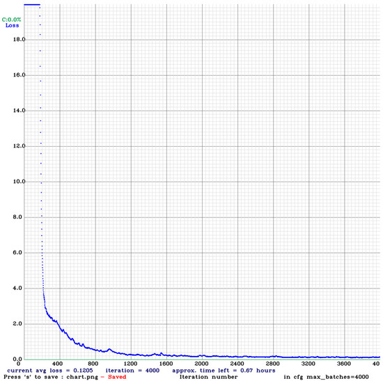 In the target detection experiment, we divide the data set into a training set and a validation set at a ratio of 8:2. The training set contains 1616 images, including 3623 gangue objects and 2312 coal objects. After 4000 rounds of training, the loss is reduced to an acceptable range and the model is obtained, as shown in Figure 6. The trained model is tested by the valid images, and the AP of coal is 98.05%, the AP of gangue is 98.27%, and the mAP of this model is 98.16%. On the basis of already meeting the high recognition accuracy rate, the recognition speed meets the real-time requirements.