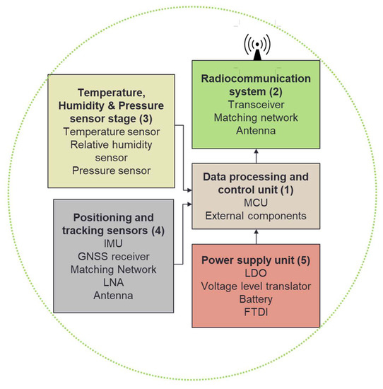 These compact light-weighted devices with a maximum target weight of 20 g and diameter of 30 cm are designed to float at altitudes between 1–2 km and be alive for approximately 1 h. The radioprobes are capable of passively tracking small-scale turbulence fluctuations inside warm clouds and surrounding air since they can be considered as markers in a Lagrangian description of the airflow. In order to enable them to float, the radioprobe electronics are housed inside 30 cm-diameter balloons made of biodegradable materials that are filled with an adequate mixture of helium gas and ambient air to reach a buoyancy force equal to the system weight. Considering that the floating devices will not be recovered once they have finished their mission, the design accounts for the use of environmental-friendly materials to minimize any possible negative impact on the environment (i.e., green). To this end, the external balloons are made of biodegradable materials tailored to provide hydrophobicity and flexibility properties [23]. In the context of research balloons, these innovative devices can be catalogued as mini ultralight instrumented weather balloons. However, they are different from other instrumented devices developed for atmospheric sounding, like the NCAR-NOAA Global Hawk tethered dropsonde (weight 167 g, length 30.5 cm, diameter 4.6 cm; square-cone parachute 20 cm on a side) used for vertical atmospheric profiling measurements (no Lagrangian trajectories) and launched by an unmanned aircraft from the National Aeronautics and Space Administration (NASA) [24], or the NOAA ground-launched smart balloon (diameter of 335 cm) housing the sensors inside the enclosure and used for Lagrangian experimental hurricane research [25]. Additional devices are the short-range ground-launched weather balloon from NOAA carrying a tethered radiosonde (balloon diameter about 152 cm) [26], and the air-released balloon-tethered microsonde (total weight 65.6 g) for supercell thunderstorm studies [27].