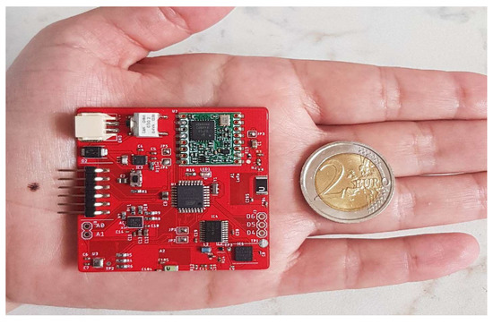 The data-processing and control unit block is the computational module of the radioprobe. It allows controlling and executing different subsystem processes in an automated way inside the device. In this unit, the data delivered by the sensors are interpreted, processed, saved, and sent through the transmission module to the ground stations. For this purpose, the onboard low-power complementary metal-oxide semiconductor (CMOS) 8-bit microcontroller ATmega328 from Microchip [32] has been selected as the central processing unit. It has 32 pins in a thin quad flat pack (TQFP) package with compact dimensions of 9 mm × 9 mm × 1 mm and a weight of 70 mg. The microcontroller requires a supply voltage in the range from 1.8 to 5.5 V and operates within temperature ranges from −40 to +85 °C. It requires low current consumption, i.e., 0.2 mA in active mode, 0.1 µA in power-down mode, and 0.75 µA in power-save mode @ 1 MHz, 1.8 V, 25 °C.