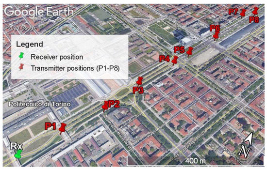 In addition, with the goal of testing the communication system of the radioprobe, some sets of measurements using different network configurations were carried out. The initial field measurement (Setup 1, Figure 4) included propagation measurements using a point-to-point static network configuration in an urban environment to identify the transmission ranges of the system in harsh propagation conditions. This test was carried out in the city of Turin, Italy, specifically within our university and its surroundings. The network setup included a radioprobe (transmitter) creating and sending a unique sensor identification (ID) together with a counter, and a ground station (receiver) receiving and storing the messages. The aim of the counter was to identify the losses of packets having a known progressive number included in the data frame. The transmitter was located at eight different positions from P1 to P8, while the receiver was located at a fixed position Rx. Also, at the receiver side, the spectrum analyzer (SA) model R&S ZVL was placed to measure the power of the signal spectrum; however, for most of the points, the noise floor of the instrument was higher than the incoming signal; thus, the measurement of the power spectrum was not possible. This behavior emphasizes the robustness of LoRa technology and the opportunity to establish communication links in challenging environments. The receiver module was programmed in order to provide useful information about the signal quality, that is, signal-to-noise ratio (SNR) and received-signal-strength indicator (RSSI) of the packets. The receiver was placed at an approximated height of 17 m and the transmitter at a height of 1 m above the street level. The tests were made using a programmed output power of 10 dBm, central frequency 865.2 MHz, spreading factor of 10, and a bandwidth of 125 kHz. The set of analyzed data consisted of blocks of 200 packets for each transmitter position. The fixed location of the ground station and the different positions of the transmitter (radioprobe) are shown in Figure 4. The obtained results of the measurements are reported in Table 2.