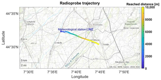 Trajectory of the fully operational radioprobe attached to the reference atmospheric sounding system, displayed on a map. The color bar indicates the separation distance reached by the system with respect to the ground station.