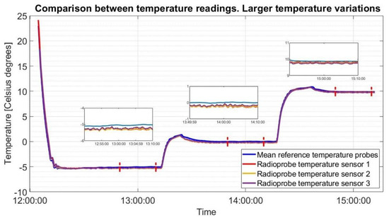 Comparison of temperature measurements between reference temperature sensors and radioprobe sensors. Climatic chamber is set to provide controlled variations in temperature starting from T = +24 °C, RH = 30% until reaching the set points of T = −5 °C, T = 0 °C, and T = 10 °C.