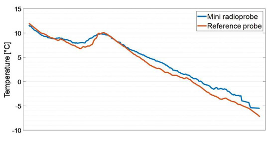 The reference atmospheric sounding system carrying the attached mini radioprobe reached a maximum height of approximately 32 km and a horizontal range of approximately 108 km before the balloon burst. The tiny radioprobe reached a maximum height of approximately 11 km, a horizontal range of 7 km, and a straight distance of 13 km before losing contact with the ground station. In total, 462 packets were sent from the mini radioprobe during the flying time for a time span of approximately 22 min after the launch.
