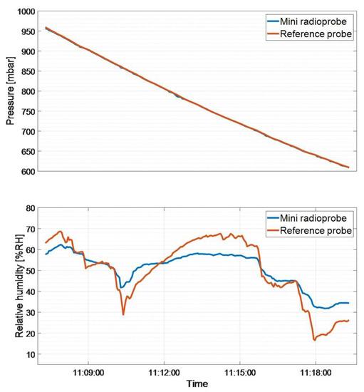 An additional field experiment was carried out to verify the response of the temperature, pressure, and humidity sensor stage nested within the radioprobe board. The data obtained came from the experiment setup using the ARPA sounding system already described in Section 4.1: antenna matching and data transmission ranges. The fully operational mini radioprobe was fixed to the front side of the reference Vaisala RS41-SG radiosonde case with the help of a nonconductive adhesive tape. It was constantly measuring, processing, packing, and transmitting the information to the base station located on the ground. The reference probe incorporated a temperature sensor using a linear resistive platinum technology, a humidity sensor integrating humidity, and additional temperature sensing elements, and a GPS receiver allowing the derivation of pressure, height, and wind data [50]. Regarding the accuracy provided by the reference instrument, the uncertainties declared for sounding are 0.3 °C for temperature measurements (below 16 km), 4% RH for humidity measurements, and 1.0 hPa/0.5 hPa for pressure measurements (for pressure values greater that 100 hPa). In order to statistically compare the obtained data, the set of measurements considered for the analysis corresponds to the interval up to which the percentage of received packets was greater than 90%. At this point, the straight distance between the flying system and the base station was approximately 5 km. The measurement results obtained are shown in Figure 8. The statistical results of this test are shown in Table 6.