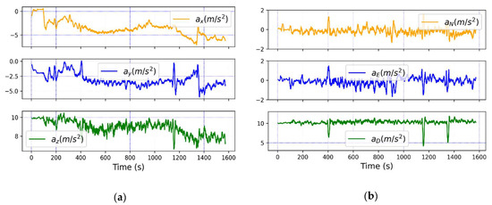 Absolute acceleration: (a) raw acceleration in radioprobe’s body frame; (b) filtered acceleration in NED (north, east, and down) frame.