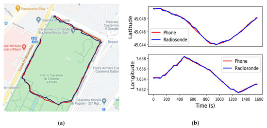 Trajectory recorded by the radioprobe (blue line) and the smartphone GPS logger (red line) during a walk: (a) trajectory comparison displayed on a map; (b) latitude and longitude comparison between the radioprobe and the smartphone GPS logger in function of time.
