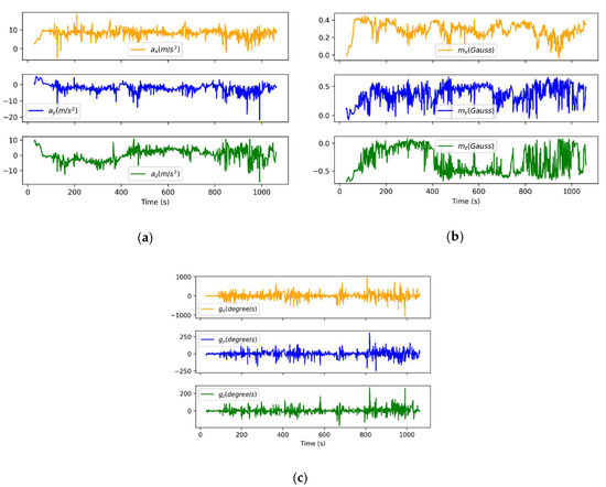 Radioprobe sensor measurements sent to the ground station for postprocessing purposes: (a) raw acceleration measured by the radioprobe sensors during the flight; (b) raw magnetic field measured by the radioprobe sensors during the flight; and (c) raw angular rate measured by the radioprobe sensors during the flight.