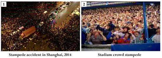 Crowd behavior in emergencies is an exciting and valuable research topic. After an urban earthquake, the demand for evacuation increases sharply in a short period. People’s behavior during an earthquake manifests as crowd behavior in emergencies. In an emergency, people tend to be crowded. For instance, on 12 March 1988, a sports competition was held at the Kathmandu Open Air Stadium in Nepal. The chaos caused by the sudden extreme weather conditions on the scene caused the audience to flee to avoid hail. The stampede of the crowd directly caused nearly 500 casualties. Not only that, another stampede accident occurred when the Muslim Hajj was held in Mecca, Saudi Arabia, on 12 January 2006, which simultaneously caused 345 deaths and nearly 400 injuries. On 31 December 2014, many people gathered at the Shanghai Bund for the New Year’s Eve countdown. Due to a large number of people at the scene and improper guidance measures, crowds colliding with each other caused some people to fall, leading directly to 36 deaths and nearly 50 injuries (see Figure 1).