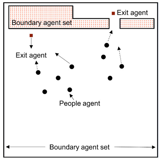 Since the boundary and exit elements could not move, they build a static field together. We constructed the boundaries using a row of fixed agents. Considering the natural behavior of avoiding walking close to the boundary, we used repulsive boundary potentials inversely proportional to the boundaries’ distance: