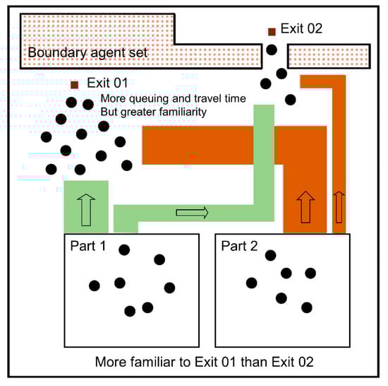 The familiarity and visibility factor limit the possible exits. These factors could be seen as binary signs, and the number of possible combinations constitutes a preference group. Agents would choose an exit from the non-empty group with the highest priority, as shown in Figure 3. The phenomenon that people would like to choose their familiar exit to escape also exists on many other occasions. It is called the exposure effect or the familiarity principle in psychology. For example, people would like to make friends with people they frequently see, and investors would change their risk perception according to their familiarity with risk events when making investments.