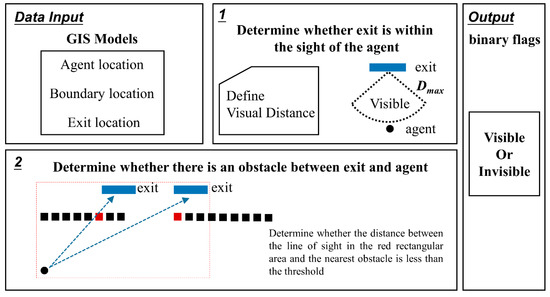 As mentioned before, the impact of familiarity and visibility of exits may limit the set of possible exits for agent , and these conditions are considered by defining two binary flags . The step to judge whether the exit is visible to agent is showed in Figure 4. The binary flags give specific information about agent :