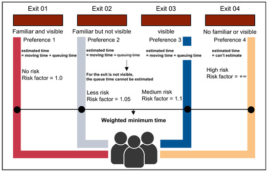 The fourth preference group describes people in a panic who are not familiar with the exits and could not see any exit. Mathematically speaking, the choice of the exit is defined as and , The specific agent chooses an exit from the non-empty group , which has the best priority number . In addition to this paper, we have also added an extra risk factor. The risk factor is simple comparison between the preferable new exit’s evacuation time and the previously chosen exit. This step is needed because it may happen that the exit in a better preference group the evacuation time could take much longer, and a better exit gets insight. So, the agent would redecide if the new preferable exit’s evacuation time is greater than the evacuation time of the agent’s previous decision. Nevertheless, to choose an unfamiliar or invisible exit, the agent may face more risks. Therefore, a risk factor was defined to quantify the decision process’s time risk, as shown in Table 2. Finally, Figure 5 briefly illustrates this process.